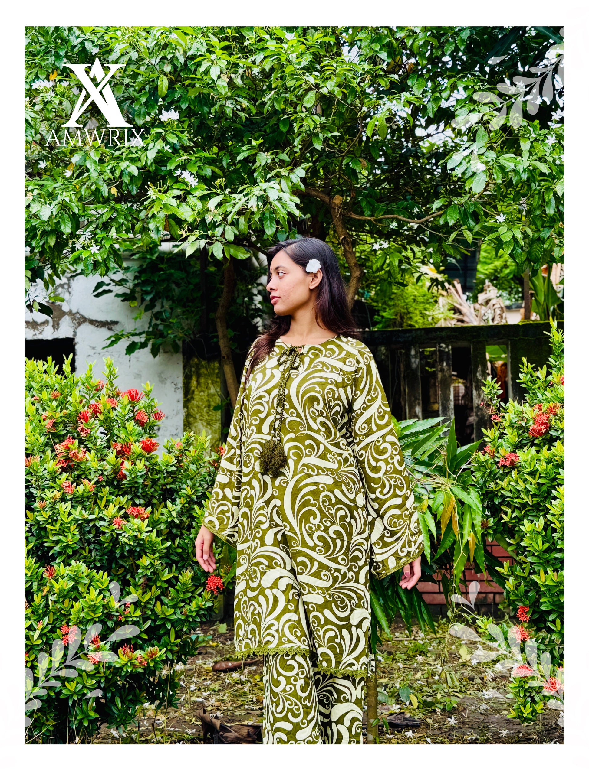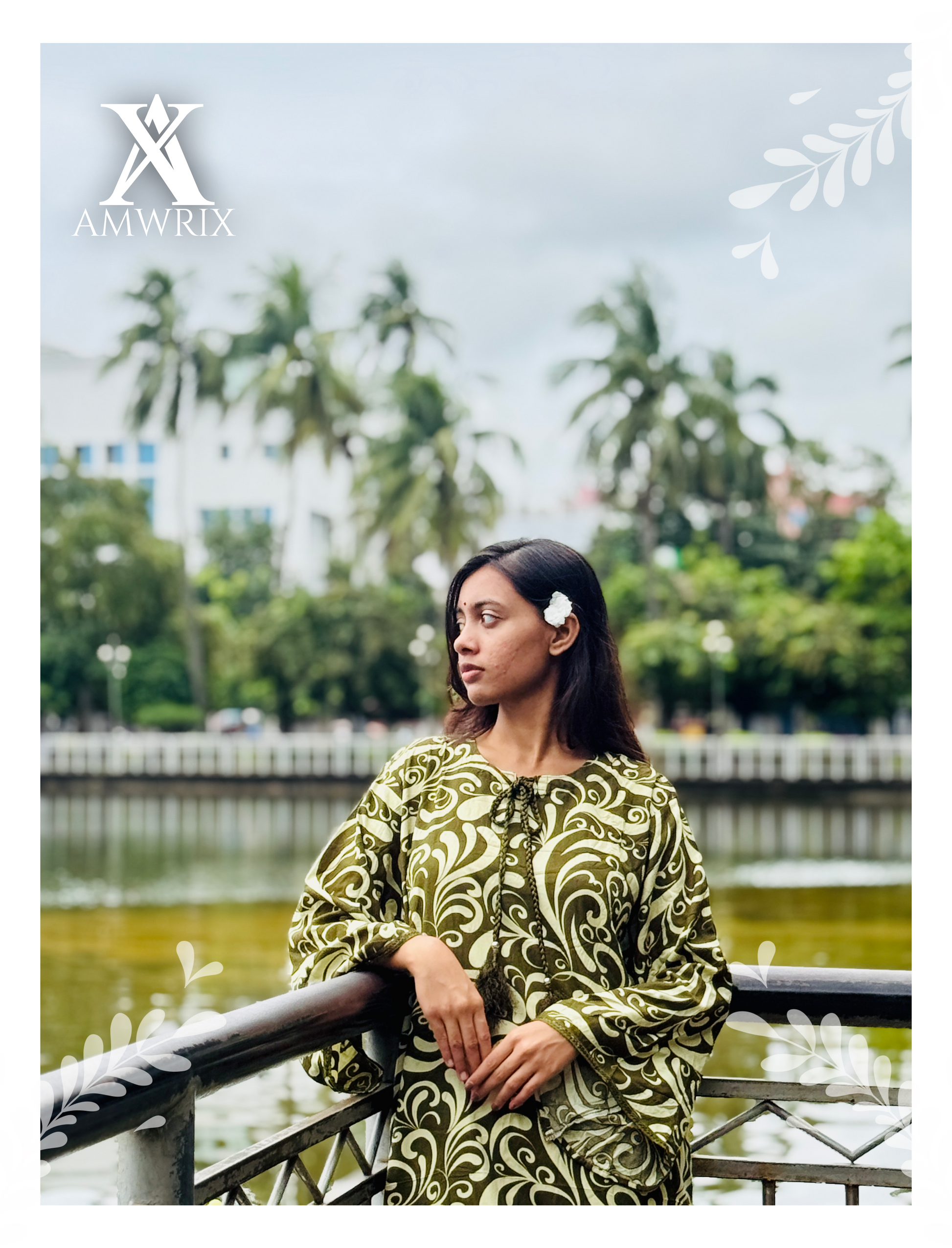 Green Grace is a stylish co-ord set in an elegant green leaf design. Crafted from soft, breathable fabric, it combines everyday comfort with graceful fashion — perfect for any occasion.